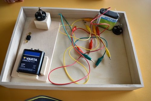 Einfache Stromkreise lassen sich leicht zusammenbauen, insbesondere dann, wenn die Elemente bereits vorgefertigt sind. Der Wow-Effekt ist dabei garantiert. Lässt man die Kinder z. B. eine kleine Glühlampe mit Krokodilklammern an eine Batterie anschliessen, bringt dies nicht nur die Glühlampe, sondern meist auch die Kinderaugen zum Leuchten. Als Erweiterung können die Kinder bei Bedarf einen Schalter einbauen oder einen Ventilator zum Drehen bringen.